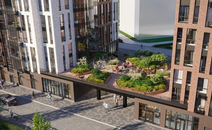 Двор будет закрыт от автомобилей и поделен на функциональные зоны - для детских игр, занятий спортом и спокойного отдыха. В подземной части разместится паркинг с доступом из лифта, на первых этажах откроется коммерция.