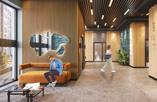 Общественные пространства сочетают в себе функциональность и домашний уют. В дизайне входных групп и парадных использованы декоративные элементы с текстурами дерева и натурального камня с приглушенной подсветкой теплым светом. Входные группы — сквозные, обустроены гостевыми зонами с мягкой мебелью. Предусмотрены помещения для хранения колясок, велосипедов, гостевой санузел и лапомойка.