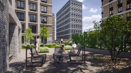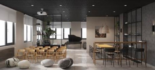 Парадные входные группы - это просторные помещения с огромными витражными окнами и эффектным интерьером. В каждом предусмотрен лифт для подъема на территорию двора, кофе-поинт, зона ожидания, а для получения посылок будут установлены постаматы. Для жителей дома будет создано пространство, где можно устраивать деловые встречи, организовывать лекции или киновечера, проводить мастер-классы и веселые вечеринки с караоке. Для музыкальных вечеров будет предоставлен рояль. В проекте будет реализован уникальный проект - музыкальная студия, с размещенным роялем, караоке и зоной коворкинга.