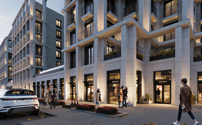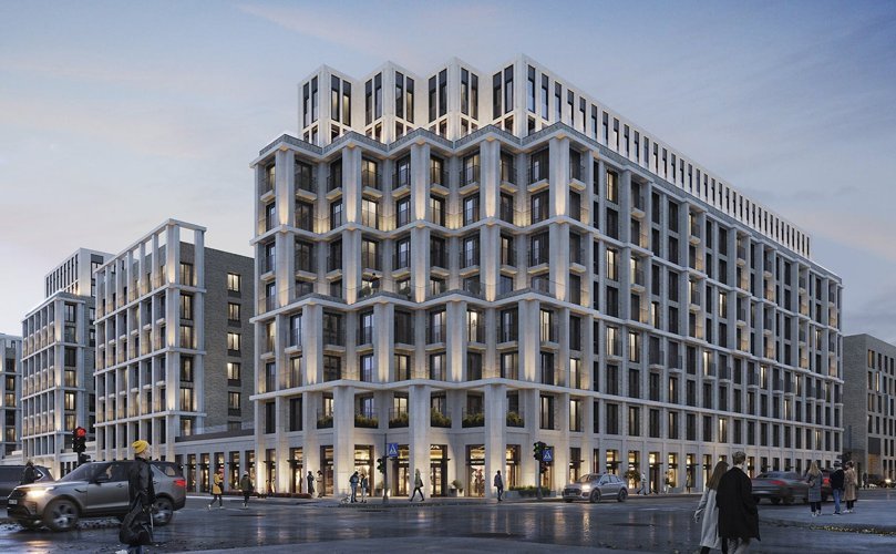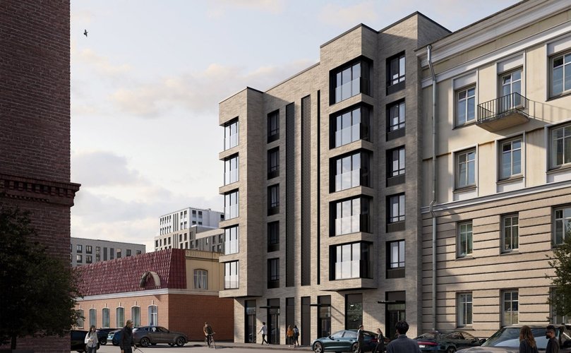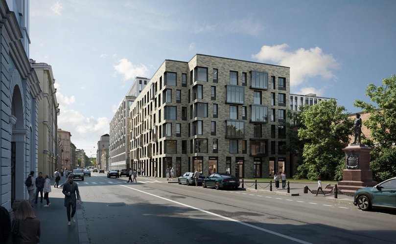 Переосмысление классических экстерьеров выражено в динамичной пластике фасада из горизонтальных тяг, вертикальных колонн, обилия выступов и масштабного остекления. Концепцию поддерживают французские балконы и оригинальные эркеры. Самая яркая часть – каскадный фасад со стороны Большого Сампсониевского проспекта с множеством углов и террас. Основным материалом лицевых фасадов является матовый лицевой кирпич или клинкерная плитка серых тонов.