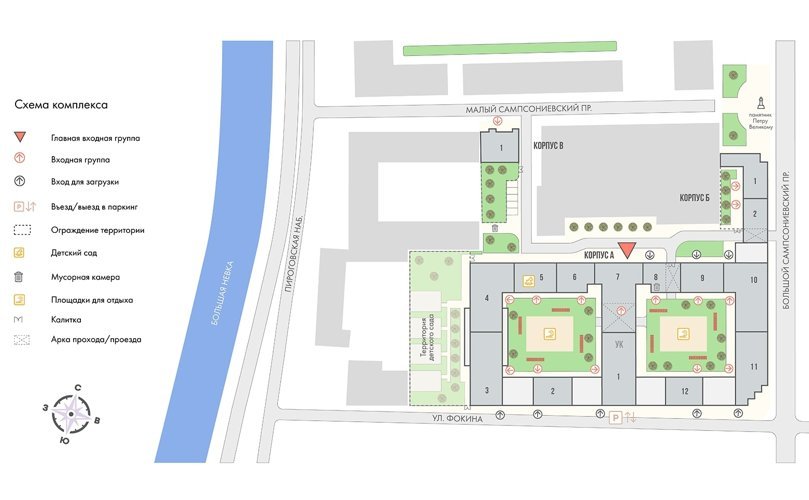 Комплекс расположен в 5 минутах пешком до набережной и метро «Выборгская». Лёгкость маршрутов в любую точку города как на общественном транспорте, так и на автомобиле: выезд на ЗСД всего за 14 минут. В непосредственной близости находятся Сампсониевский и Выборгский сады. Рядом – знаменитый Ботанический сад. Пейзажный ансамбль обрамляют мосты (Гренадерский, Сампсониевский, Аптекарский) и променады на набережных вдоль Невы и реки Карповки.